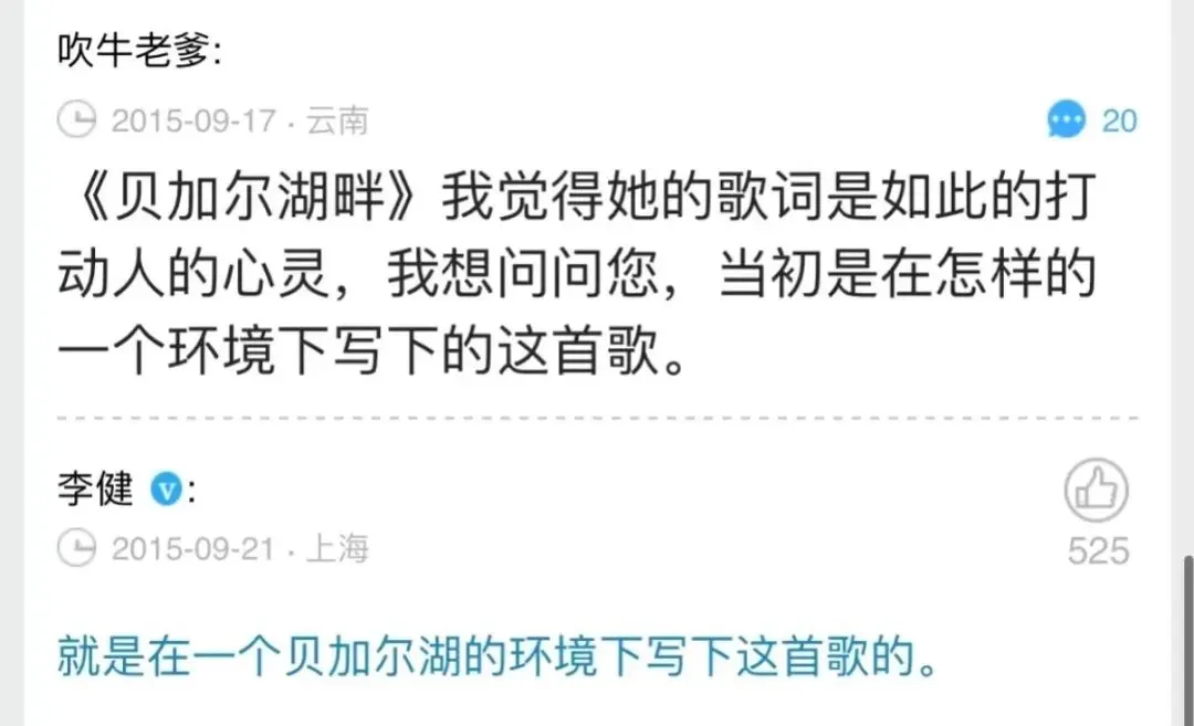 网友好奇,如此打动人心的《贝加尔湖畔》是在什么样的环境下写出的,李健回答的也很认真: